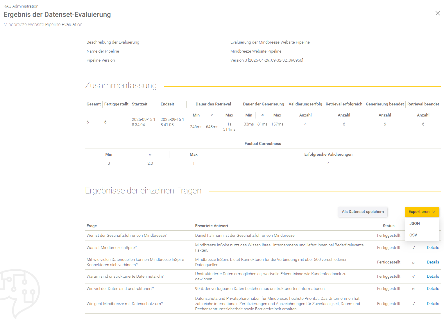 Evaluierungen können nur als JSON-Datei exportiert werden.