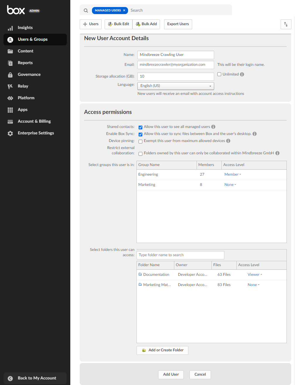 Dieser Benutzer muss dann ebenfalls über ein Login aktiviert werden, damit er vom Box Crawler verwendet werden kann.