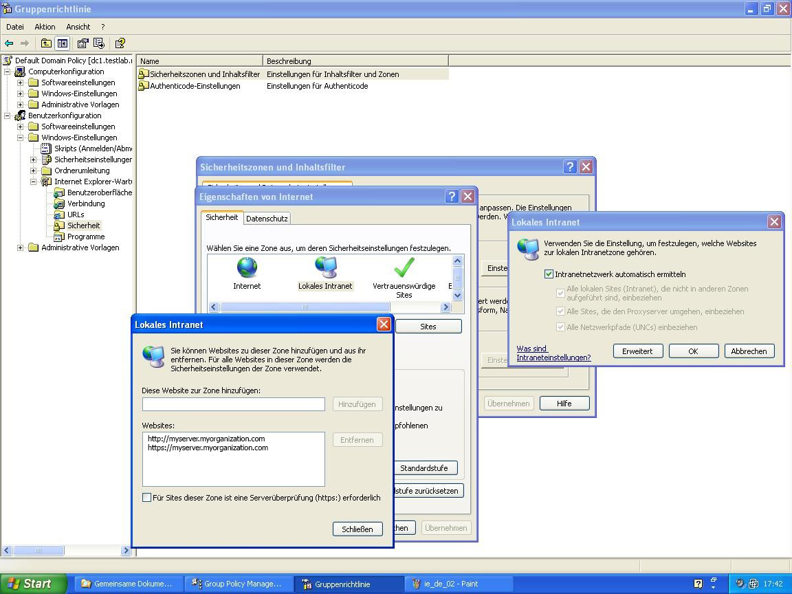 Um den Microsoft Internet Explorer automatisch für alle Mitglieder Ihrer Domäne zu konfigurieren, kann die Adresse der Client Service Webseite auch über die Gruppenrichtlinien zu den vertrauenswürdigen Webseiten hinzugefügt werden.