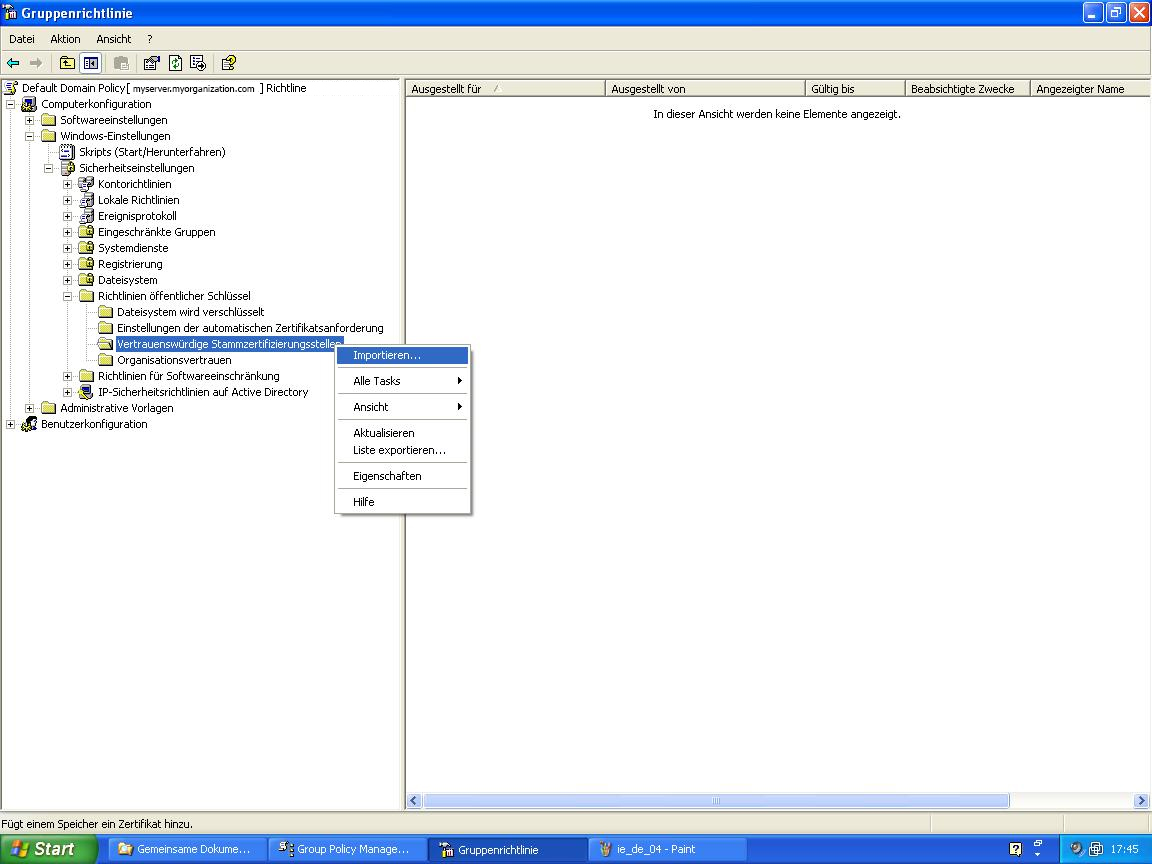 Zusätzlich können Sie auch das Zertifikat von Mindbreeze InSpire in die Liste der vertrauenswürdigen Zertifikate einfügen. Dies wird benötigt damit bei einer Verbindung über https der Web Client eindeutig identifiziert werden kann. Dazu navigieren Sie bitte durch Computerkonfiguration > Windows-Einstellungen > Sicherheitseinstellungen > Richtlinien öffentlicher Schlüssel zum Knoten „Vertrauenswürdige Stammzertifizierungsstellen“. Öffnen Sie mit einem Rechtsklick auf diesen das Kontextmenü und wählen Sie dort den Punkt „Importieren“.