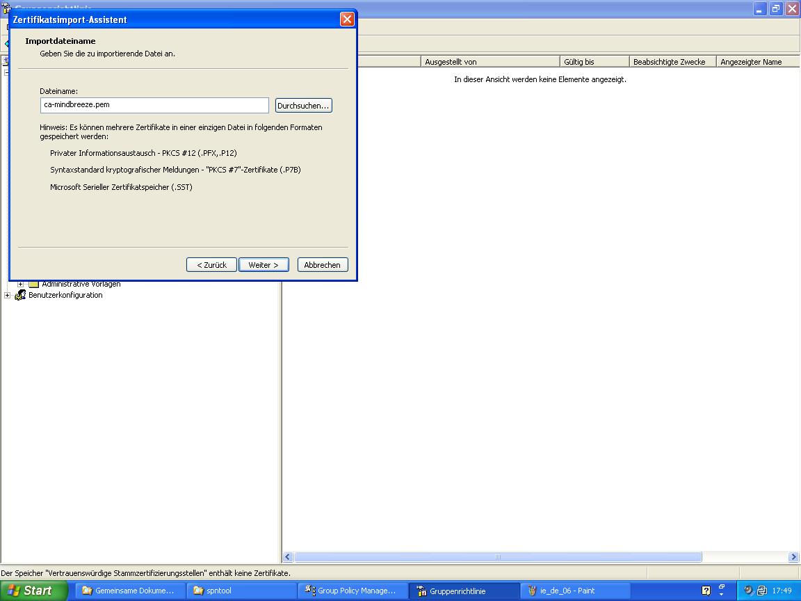 Den ersten, nun erscheinenden, Dialog bestätigen Sie bitte mit „Weiter“. Im nun erscheinenden Dialog wählen Sie das Zertifikat von Mindbreeze InSpire aus. Dieses befindet sich im Installationsordner (z.B. C:\Programme\Mindbreeze\Enterprise Search\Server) und trägt den Namen ca-mindbreeze.pem. Bestätigen Sie den nächsten Dialog mit „Weiter“ und den darauf folgenden mit „Beenden“
