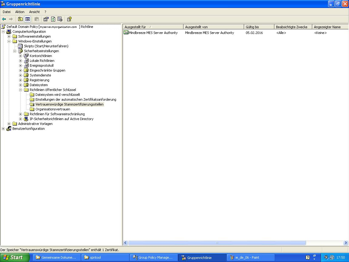 Nun sollte sich unter „Vertrauenswürdige Stammzertifizierungsstellen“ ein Eintrag mit dem Namen Mindbreeze MES Server Authority befinden. Schließen Sie jetzt alle offenen Fenster und Dialoge die im Zusammenhang mit dem Verwaltungswerkzeug „Active Directory, Benutzer und Computer“ geöffnet wurden. Die Änderungen sollten nun nach einem Neustart aktiviert werden. Sie können nun den Mindbreeze Enterprise Web Client auf Microsoft Internet Explorer in Ihrer Domäne uneingeschränkt benutzen.