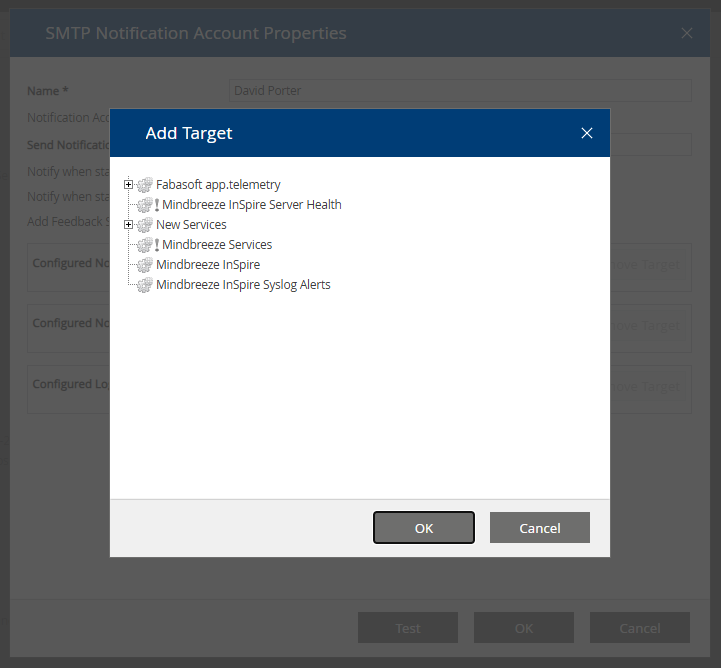 Sollten Sie separate Logs überwachen wollen, klicken Sie bei „Configured Notification Targets“ auf „Add Target“. Im nun erschienenen Fenster können Sie nun zum Beispiel „Mindbreeze InSpire Syslog Alerts“ öffnen, dann „Fabasoft.app.telemetry Server Counters / Mindbreeze Service Syslog Alert Service“ öffnen und die jeweiligen Logs wählen.
