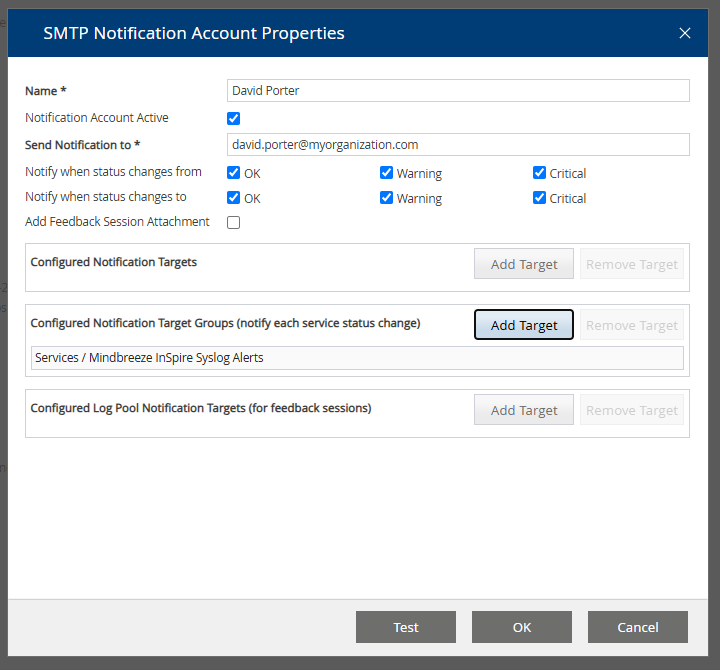 Sollten Sie eine gesamte Logpool-Gruppe überwachen wollen, klicken Sie bei „Configured Notification Target Groups (notify each service status change)“ auf „Add Target“. Im nun erschienenen Fenster können Sie nun zum Beispiel „Mindbreeze InSpire Syslog Alerts“ auswählen.