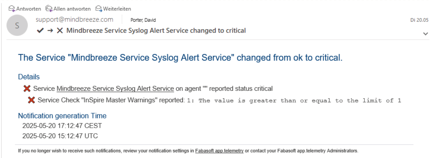 Durch die Aktivierung des Notifikation-Konto erhalten Sie nun Email-Benachrichtigungen über Fehler oder Warnungen, die zum Beispiel so aussehen könnten: