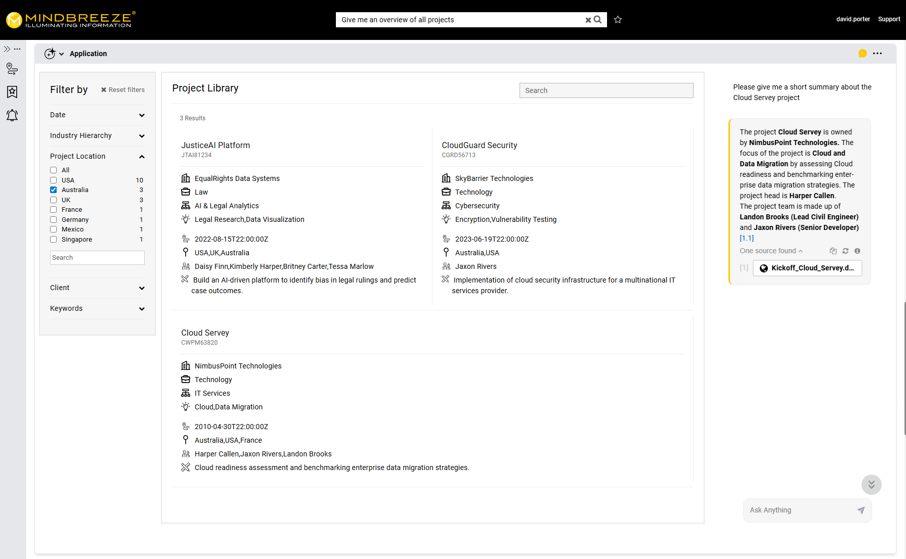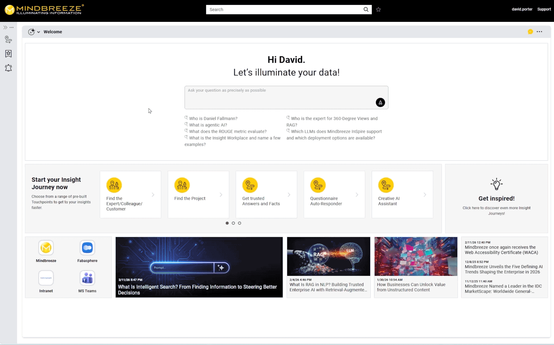 Der Mindbreeze Insight Workplace fungiert als zentraler Einstiegspunkt für den Zugriff auf vorhandene Unternehmensdaten. Durch die nahtlose Anbindung und Analyse von Informationen aus unterschiedlichen Systemen wird der Zugriff und die Nutzung relevanter Inhalte deutlich vereinfacht.