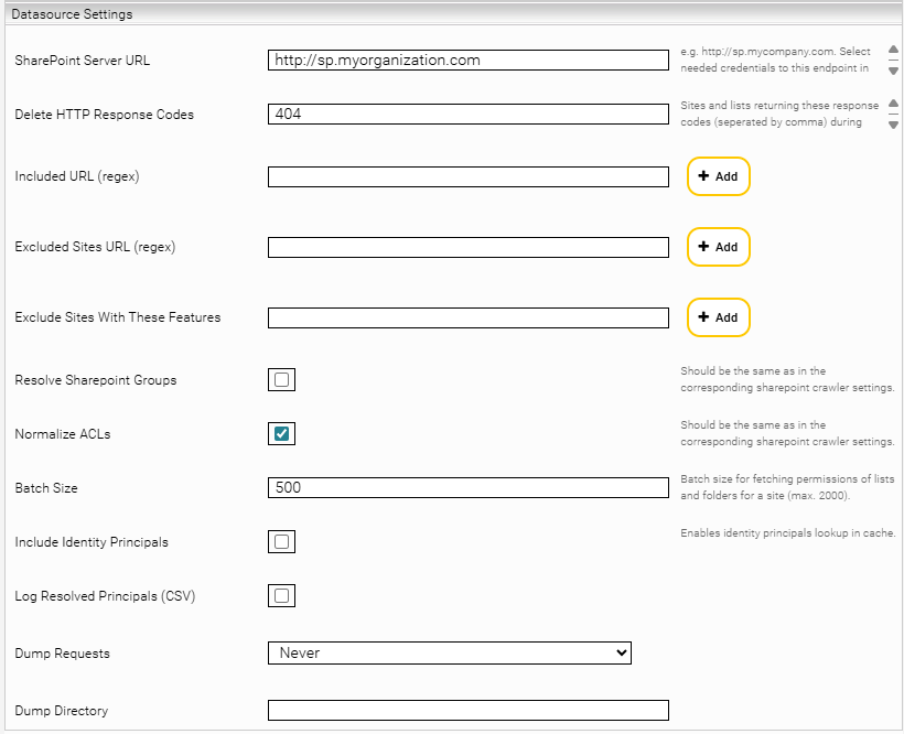 SharePoint Server URL | Example: http://sp.myorganization.com Hint: The URL must be the same as in the setting “SharePoint Server URL” of the data source of the index and the SharepointPrincipalCache service. |