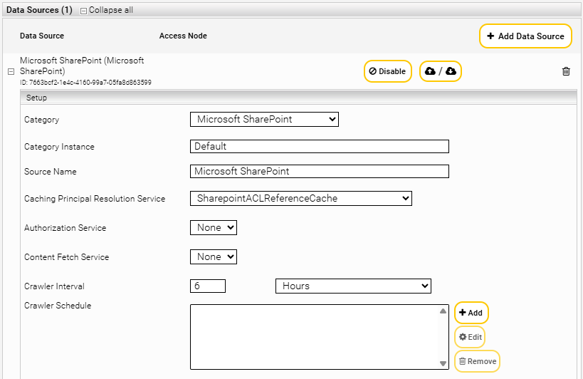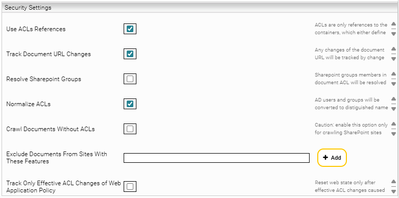 SharePointACLReferenceCache: When selected, the URLs from the SharePoint site, SharePoint list, and folder of the document are saved as ACLs during crawling to speed up the crawl. “Use ACLs References" must be selected in this case. “Resolve SharePoint Groups” and “Normalize ACLs” may not be selected (Also see section Configuration of SharepointACLReferenceCache).