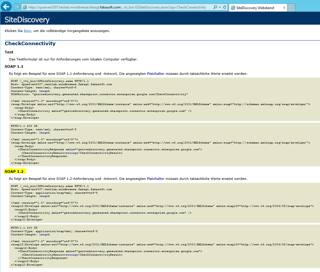 The procedure of preparing the SOAP-Calls is quite similar for every test case and will be explained based on following example: CheckConnectivity from GSSiteDiscovery.asmx