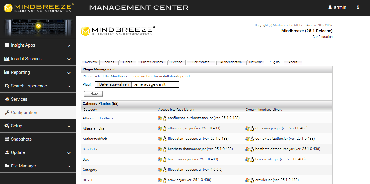 To install the plug-in, open the Mindbreeze Management Center. Select “Configuration” from the menu pane on the left-hand side. Then navigate to the “Plugins” tab. Under “Plugin Management,” select the appropriate zip file and upload it by clicking “Upload.” This automatically installs or updates the connector, as the case may be. In the process, the Mindbreeze services are restarted.